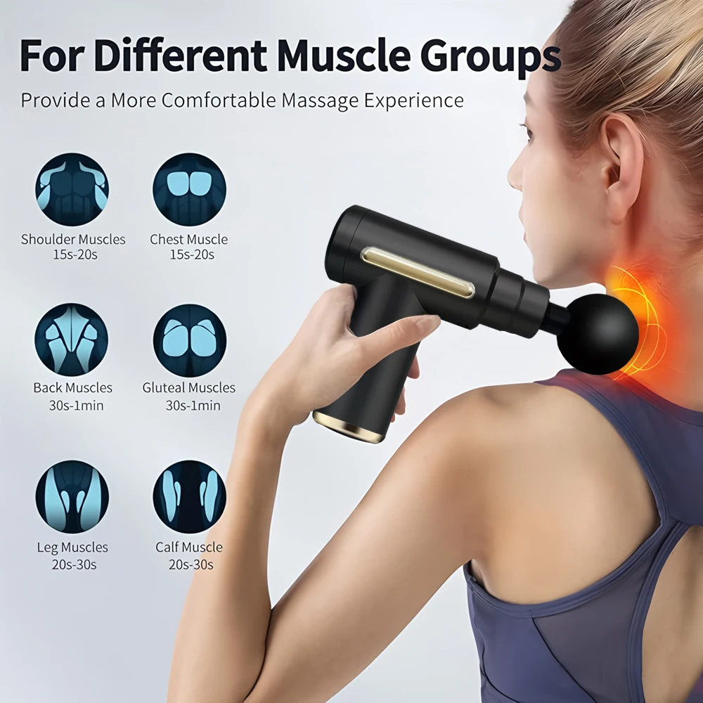 Turn on the device, select your preferred speed level, and gently move it across the targeted muscle group. Use 15–60 seconds per area. Switch massage heads for optimal results on different body parts.